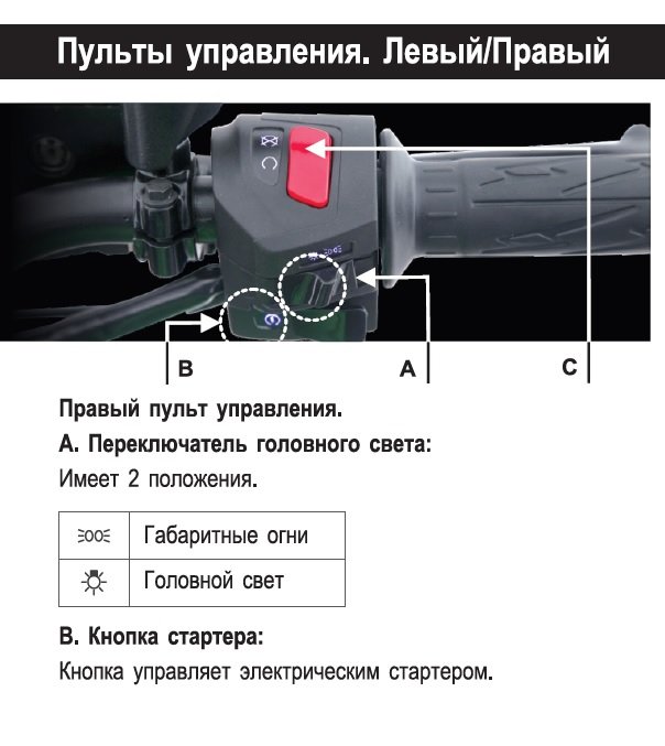 , справа переключатель, вернее включатель света, в одном положении выключен свет при заводе загорается дальний (при этом можно мигать ближним светом крючком слева), при включенном положении начинает работать левый переключатель дальний/ближний.